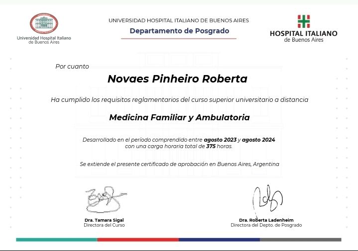 Sou Médica graduada pela Universidad de Buenos Aires, Argentina, e revalida pela UFES, atuando em Medicina da Família e Comunidade em Cachoeiro de Itapemirim, ES, desde fevereiro de 2025, além de atuar em pronto socorro de clínica médica adultos e como médica Hospitalista plantonista (generalista/ adulto), no Hospital Unimed de Cachoeiro de Itapemirim ÉS.
